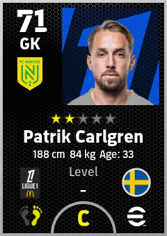 . Patrik Carlgren is a Goalkeeper footballer from Sweden who plays for Fc Nantes in eFootball 2026.