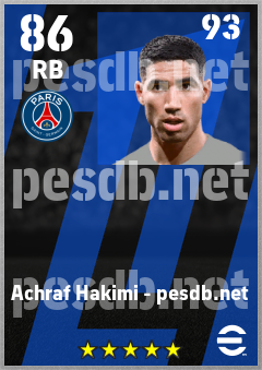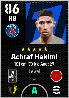 . Achraf Hakimi is a Right Back footballer from Morocco who plays for Paris Saint-Germain in eFootball 2026.