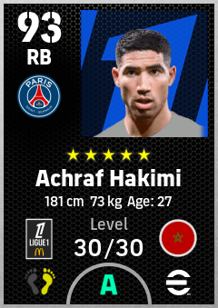 .Achraf Hakimi is a Right Back footballer from Morocco who plays for Paris Saint-Germain in eFootball 2026.
