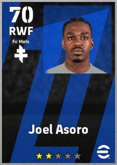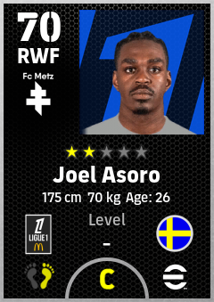 . Joel Asoro is a Right Wing Forward footballer from Sweden who plays for Fc Metz in eFootball 2026.