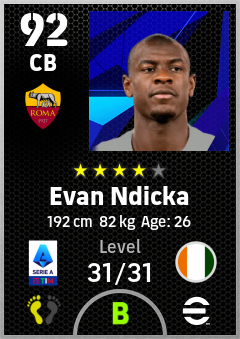 . Evan Ndicka is a Center Back footballer from Côte D'ivoire who plays for Roma Gr in eFootball 2026.