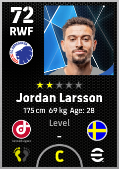 . Jordan Larsson is a Right Wing Forward footballer from Sweden who plays for København Hb in eFootball 2026.