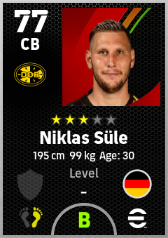 . Niklas Süle is a Center Back footballer from Germany who plays for Borussia Dortmund in eFootball 2026.