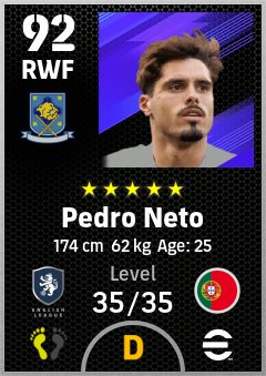 . Pedro Neto is a Right Wing Forward footballer from Portugal who plays for Chelsea B in eFootball 2026.