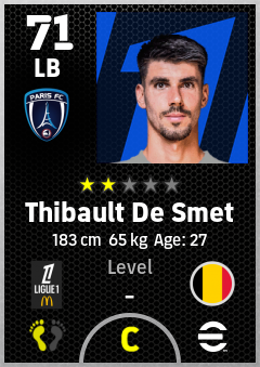 . Thibault De Smet is a Left Back footballer from Belgium who plays for Paris Fc in eFootball 2026.