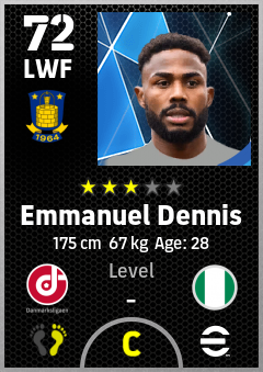 . Emmanuel Dennis is a Left Wing Forward footballer from Nigeria who plays for Brøndby Gb in eFootball 2026.