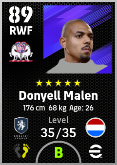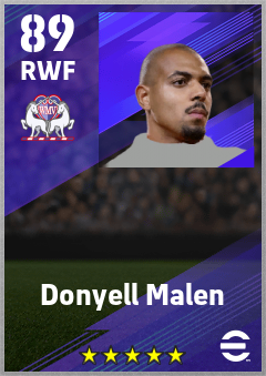 . Donyell Malen is a Right Wing Forward footballer from Netherlands who plays for Aston Rb in eFootball 2026.