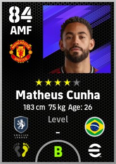. Matheus Cunha is a Attacking Midfielder footballer from Brazil who plays for Manchester United in eFootball 2026.