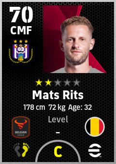 . Mats Rits is a Center Midfielder footballer from Belgium who plays for Anderlecht Pw in eFootball 2026.