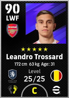 . Leandro Trossard is a Left Wing Forward footballer from Belgium who plays for Arsenal Fc in eFootball 2026.