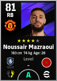 . Noussair Mazraoui is a Right Back footballer from Morocco who plays for Manchester United in eFootball 2026.