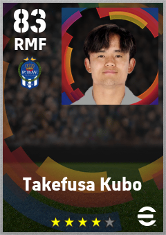 . Takefusa Kubo is a Right Midfielder footballer from Japan who plays for Vasco Gipuzkoa Ab in eFootball 2026.