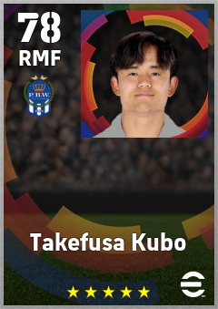 . Takefusa Kubo is a Right Midfielder footballer from Japan who plays for Vasco Gipuzkoa Ab in eFootball 2026.