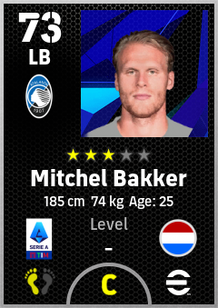 . Mitchel Bakker is a Left Back footballer from Netherlands who plays for Atalanta Bc in eFootball 2026.