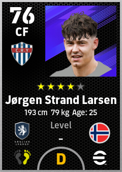 . Jørgen Strand Larsen is a Center Forward footballer from Norway who plays for Crystal Palace Rb in eFootball 2026.