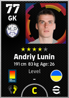 . Andriy Lunin is a Goalkeeper footballer from Ukraine who plays for Madrid Chamartin B in eFootball 2026.