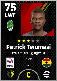 . Patrick Twumasi is a Left Wing Forward footballer from Ghana who plays for Jeonju G in eFootball 2026.