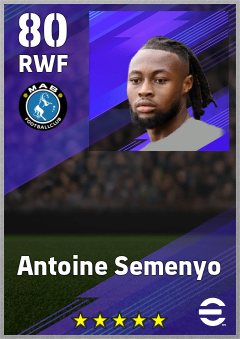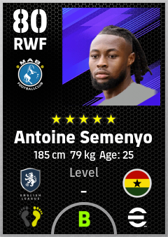 . Antoine Semenyo is a Right Wing Forward footballer from Ghana who plays for Manchester B in eFootball 2026.