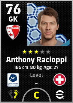 . Anthony Racioppi is a Goalkeeper footballer from Switzerland who plays for Sion Rw in eFootball 2026.