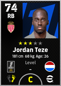. Jordan Teze is a Right Back footballer from Netherlands who plays for As Monaco in eFootball 2026.