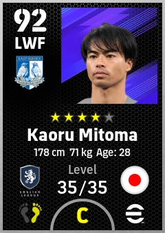 . Kaoru Mitoma is a Left Wing Forward footballer from Japan who plays for Brighton Wb in eFootball 2026.