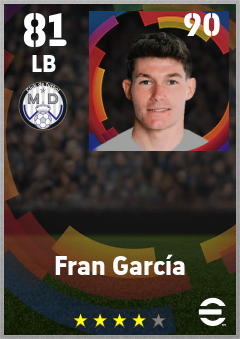 . Fran García is a Left Back footballer from Spain who plays for Madrid Chamartin B in eFootball 2026.