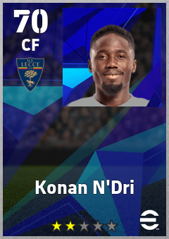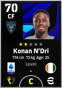 . Konan N'dri is a Center Forward footballer from Côte D'ivoire who plays for Lecce Gr in eFootball 2026.