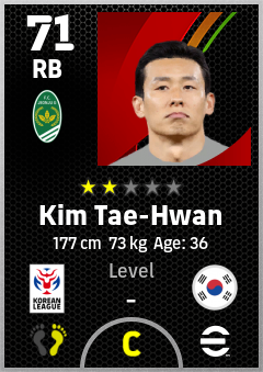 . Kim Tae-Hwan is a Right Back footballer from Korea Republic who plays for Jeonju G in eFootball 2026.