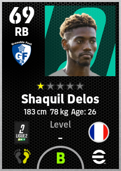 . Shaquil Delos is a Right Back footballer from France who plays for Grenoble Foot 38 in eFootball 2026.