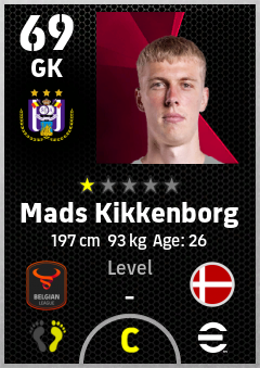 . Mads Kikkenborg is a Goalkeeper footballer from Denmark who plays for Anderlecht Pw in eFootball 2026.