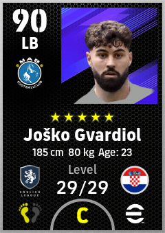 . Joško Gvardiol is a Left Back footballer from Croatia who plays for Manchester B in eFootball 2026.