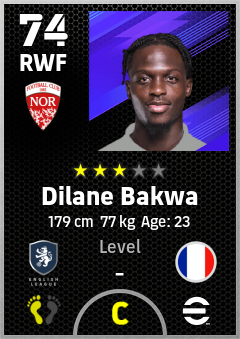 . Dilane Bakwa is a Right Wing Forward footballer from France who plays for Nottingham Rw in eFootball 2026.