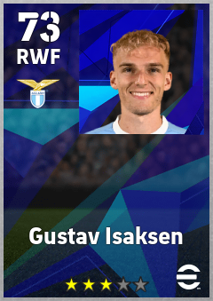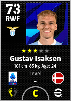 . Gustav Isaksen is a Right Wing Forward footballer from Denmark who plays for S.s. Lazio in eFootball 2026.