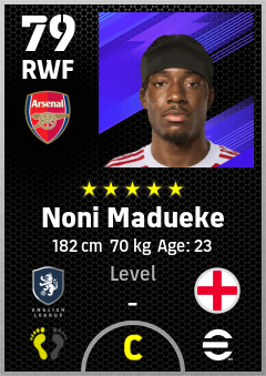 . Noni Madueke is a Right Wing Forward footballer from England who plays for Arsenal Fc in eFootball 2026.