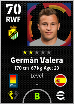 . Germán Valera is a Right Wing Forward footballer from Spain who plays for Elche Bv in eFootball 2026.