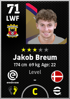 . Jakob Breum is a Left Wing Forward footballer from Denmark who plays for Go Ahead Eagles in eFootball 2026.
