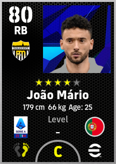 . João Mário is a Right Back footballer from Portugal who plays for Piemonte Bn in eFootball 2026.