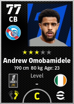 . Andrew Omobamidele is a Center Back footballer from Republic Of Ireland who plays for Rc Strasbourg Alsace in eFootball 2026.