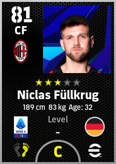 . Niclas Füllkrug is a Center Forward footballer from Germany who plays for Ac Milan in eFootball 2026.
