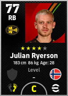 . Julian Ryerson is a Right Back footballer from Norway who plays for Borussia Dortmund in eFootball 2026.