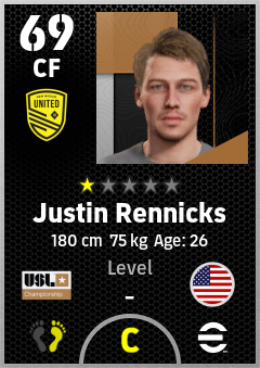 . Justin Rennicks is a Center Forward footballer from United States who plays for New Mexico United in eFootball 2026.