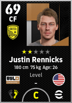 . Justin Rennicks is a Center Forward footballer from United States who plays for New Mexico United in eFootball 2026.