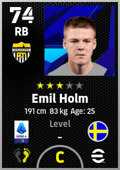 . Emil Holm is a Right Back footballer from Sweden who plays for Piemonte Bn in eFootball 2026.