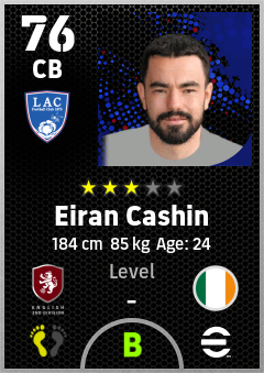 . Eiran Cashin is a Center Back footballer from Republic Of Ireland who plays for Blackburn Bw in eFootball 2026.