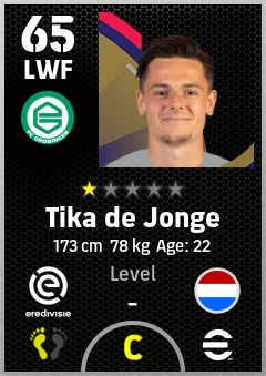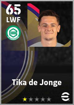 . Tika De Jonge is a Left Wing Forward footballer from Netherlands who plays for Fc Groningen in eFootball 2026.
