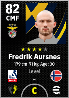 . Fredrik Aursnes is a Center Midfielder footballer from Norway who plays for Sl Benfica in eFootball 2026.