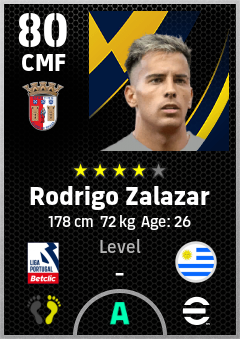 . Rodrigo Zalazar is a Center Midfielder footballer from Uruguay who plays for Sporting Braga in eFootball 2026.