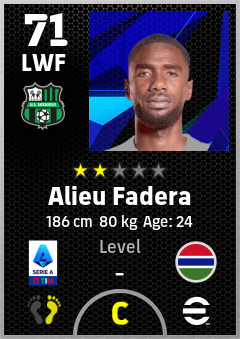 . Alieu Fadera is a Left Wing Forward footballer from The Gambia who plays for Sassuolo Nv in eFootball 2026.