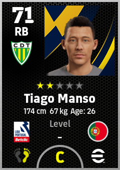 . Tiago Manso is a Right Back footballer from Portugal who plays for Cd Tondela in eFootball 2026.