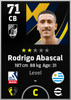 . Rodrigo Abascal is a Center Back footballer from Uruguay who plays for Vitória Sc in eFootball 2026.